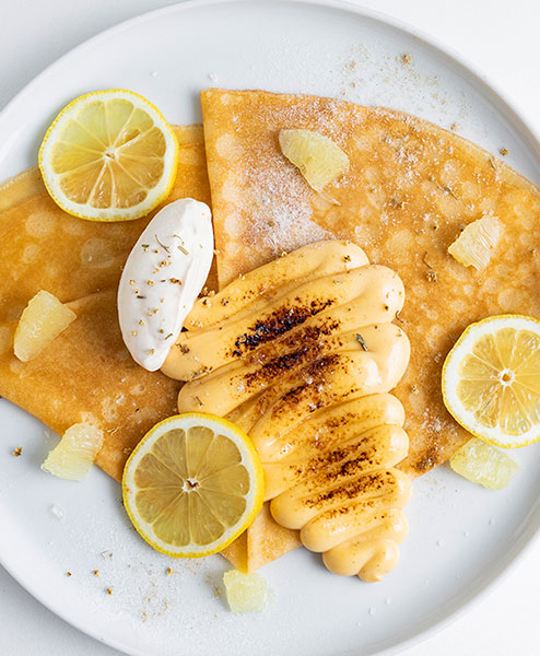 クレープの原材料には、小麦粉、強力粉、そば粉、牛乳、バター、きび糖、ナッツ類を使用しております。